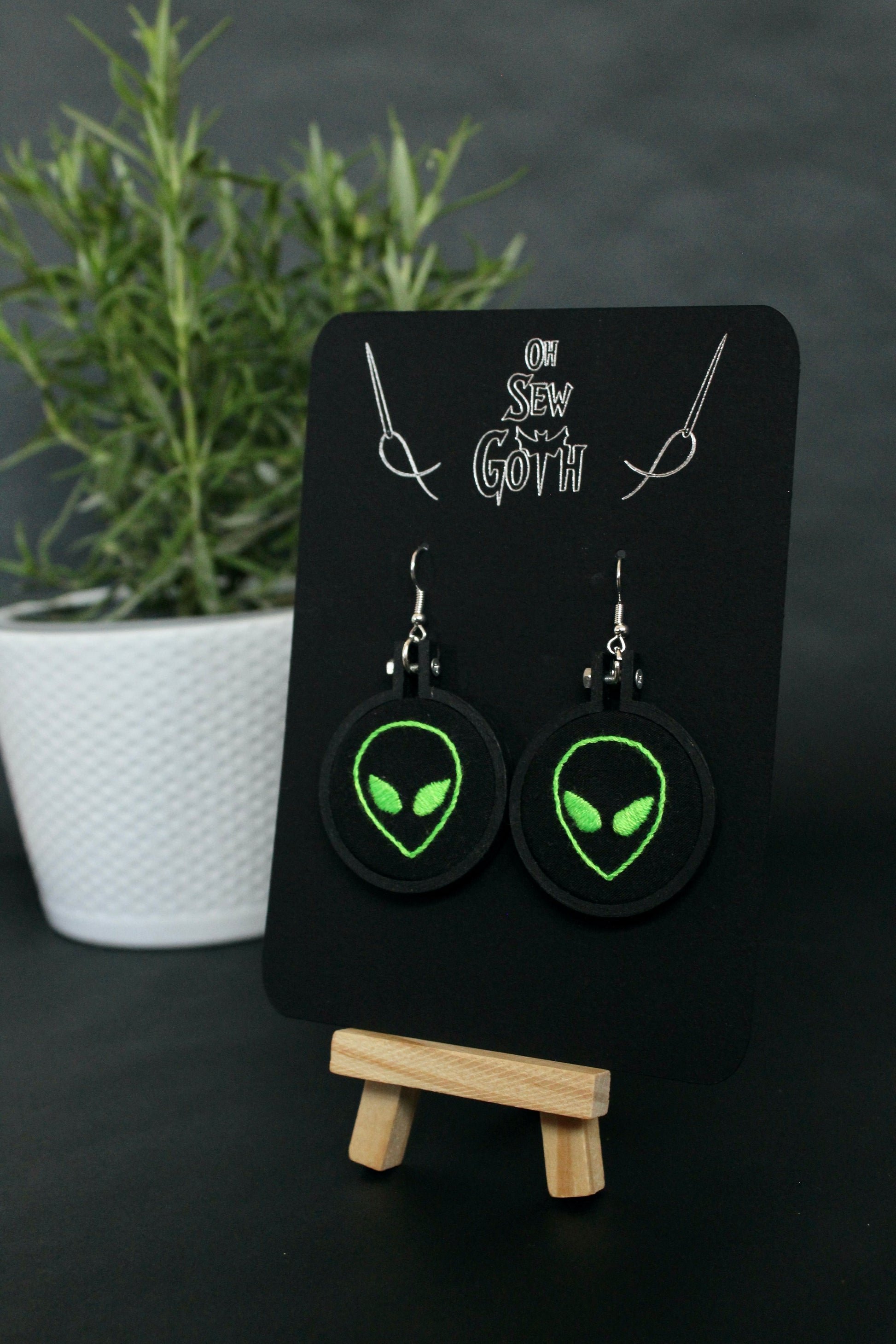 Ground control, we're getting some interference here! Add something out of this world to your collection with these handmade black and green alien embroidered earrings.