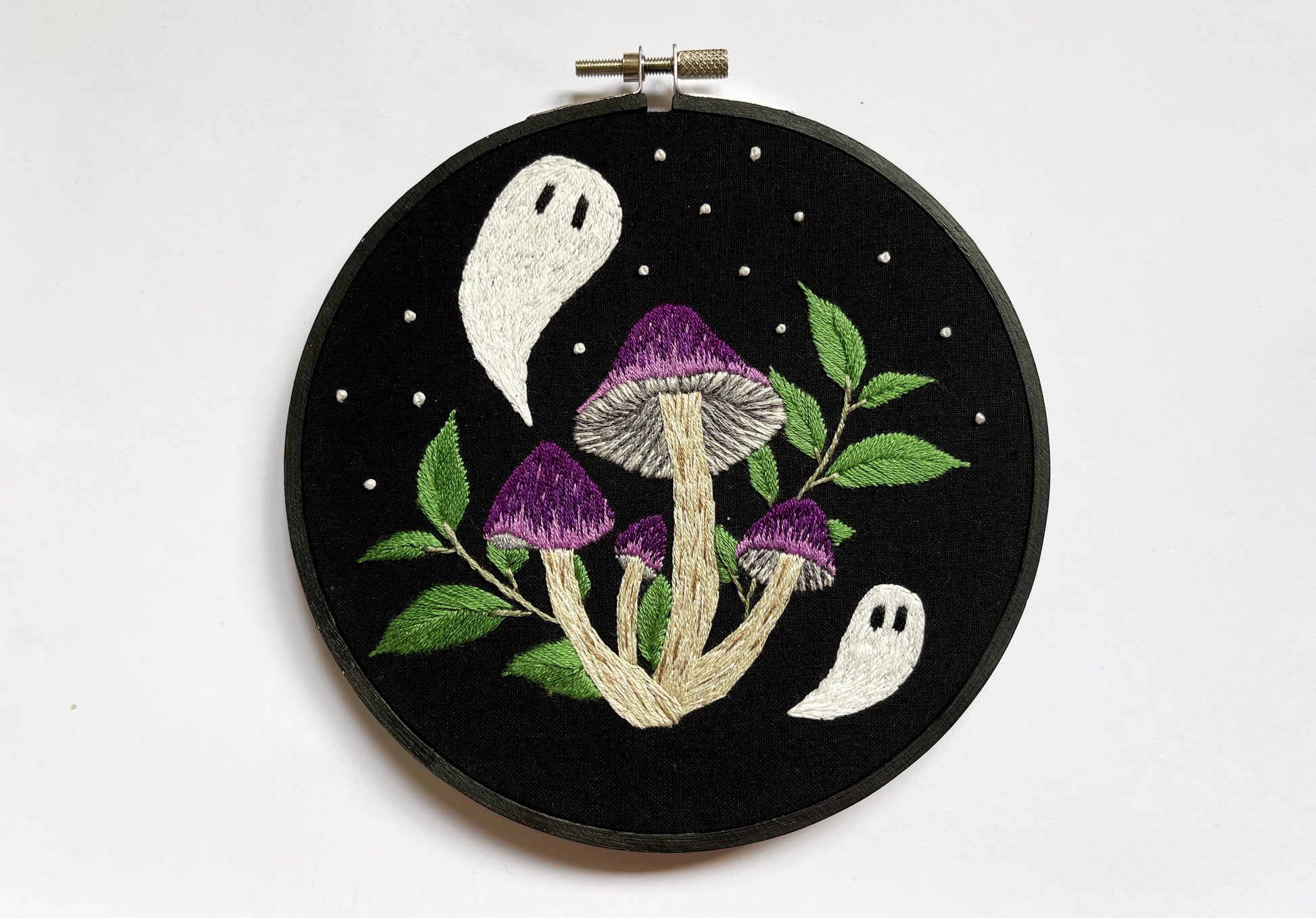 This piece has been completely hand stitched by me with cotton thread onto black cotton fabric set in a 6 inch wooden hoop (17cm tall including screw and 16.2cm wide). This hoop is backed with black felt.